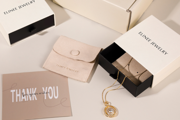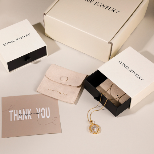 Every order is packaged in our signature Elinee Jewelry packaging, designed to accompany the elegance of your custom Elinee Jewelry item. The box is also made to protect your jewelry. Inside you will find your special purchase, a thank you card from us. Each item is placed in one of our dainty keeper pouches, perfect for travel and storage.